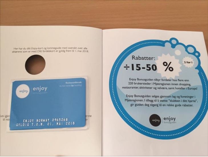 Rabatten trekkes direkte når man viser frem Enjoy-kortet ved betaling. Kortet er tjent inn etter 1-2 gangers bruk, og med en gyldighetsperiode frem til 1. mai neste år har dere god tid til å benytte dere av alle rabattene.